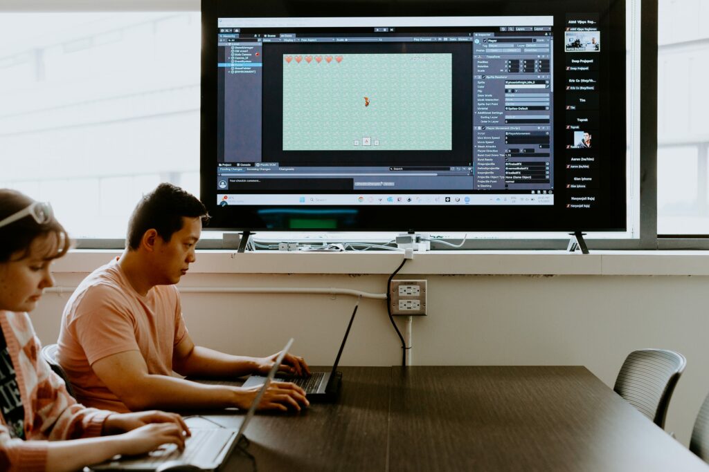 Two students work on laptops at a table, with a larger screen displaying a game development interface in the background.