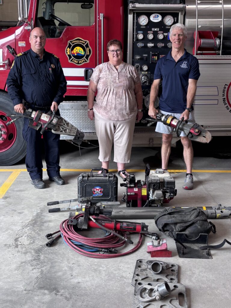 The French River Fire Department has donated auto extrication equipment to Cambrian College’s Pre-Service Firefighter Education and Training program. Pictured (left to right) are: Roche Bigras, Chief, French River Fire Department; Gisele Pageau, Mayor of French River; and David Tessier, a professor in Cambrian’s Pre-Service Firefighter Education and Training, Cambrian College.