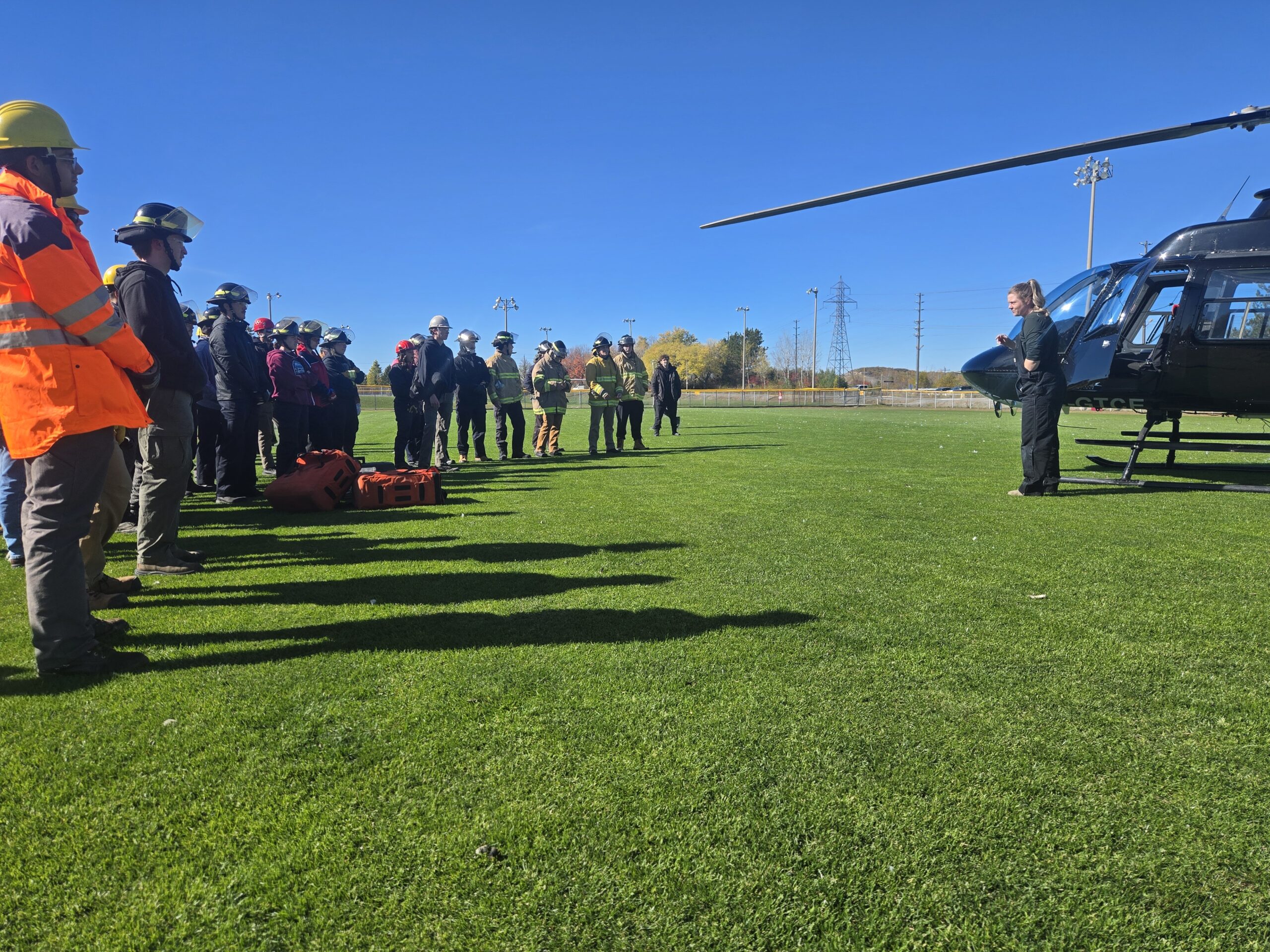 Students in Cambrian’s Pre-Service Firefighter Education and Training program learn how to work around a helicopter as part of a new optional course, Wildland Firefighting Training. The training was conducted on Cambrian College’s soccer field.